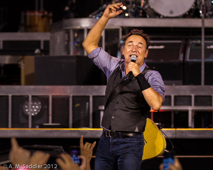 I've often writen about how I go about my daily workflow each morning in order to bring you The Concert Photo of the Day. Normally I bring up how a simple thought or a song that invades my head will put me on the path to whatever I need to write that day. Since I don't prepare these writen rambling, or normally pick out a photo, beforehand, there is always an element of fresh and hot off the mind griddle being served up. And if you've read this for any length of time, I've also written about how there are times where I stare at a blinking cursor, often for hours, and come up blank until I don't. Somehow, something will always present itself to me during that period of waiting and, sooner or later, it will all come together. This morning, I had a new one thrown at me. I had an idea on what to do as I went to sleep last night and woke up planning on executing that idea into today's narrative. I started writing and realized it wasn't going to work out how I hoped. So, I went down another path and the same thing happened. And I did it again...and again...and again. Now I've had to back off from an idea and let it be until it is the right time to revisit it and realize it's potential...sometimes you have to put things aside for awhile. Today wasn't one of those time. Each idea, as I started typing it out proved itself to be pure crap...without anything worth saving. I mean, upon reading, I couldn't help but think that if this is what I produce, I should probably stop even trying to produce. Perhaps I'm not meant to do this anymore and should focus on something new and more productive in my life. Heavy things to be thinking so early in the morning; eh? I can't say that the weather, rainy, damp and dismal, is helping matters. Unlike the girl with the Raspberry Beret, something about the clouds and me don't mix. So, that's what I'm left with today...bad ideas and even worse execution. Well, I do have a photo that I like that was taken on one of those nights that took a long, long time to unfold...from the Bruce Springsteen and The E Street Band final show at MetLife Stadium on 9/22/12. That was the concert that seemed like it would never happen...a long build up...things not working out the way they should...weather that put a damper and more on the proceedings and taking enough time to happen that Mr. Springsteen ended up having to work on his birthday...a day that he had planned to take off. Despite all that, the concert worked out better than well. So I'm thinking that maybe I just have to wait this all out and look at it again later. Can I call a do over? Today's photo was taken with a Canon 7D camera body coupled with a Canon EF 70 - 200 mm f/2.8 IS lens at a focal length of 150 mm. The camera settings were ISO 1250, f/2.8 and a shutter speed of 1/640 of a second. |